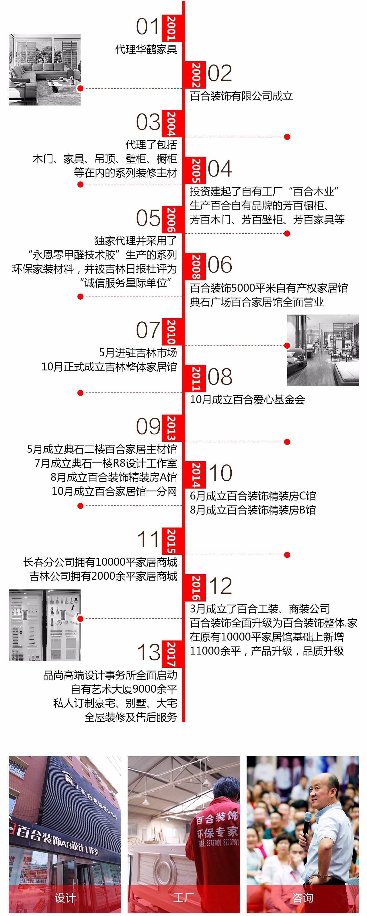 2000年,緣起家具代理,進(jìn)而挺進(jìn)裝修行業(yè),重設(shè)計(jì)、抓工程,秉承誠(chéng)信做人、善美做事的宗旨,風(fēng)雨前行25年,現(xiàn)已擁有自主生產(chǎn)工廠、20000余平的家居展館、100余人優(yōu)秀設(shè)計(jì)師團(tuán)隊(duì)、吉林及長(zhǎng)春主打賣場(chǎng),同時(shí)更形成了慧百咨詢、百合裝飾、芳百自主工廠、慧百影視四大產(chǎn)業(yè)格局。相比最初,或許您看到的是我質(zhì)的變化,但仍有更大的空間需要我去成長(zhǎng),所有朋友,請(qǐng)繼續(xù)見(jiàn)證!百合裝飾以永遠(yuǎn)保持開(kāi)拓進(jìn)取的精神,不滿足現(xiàn)狀,敢于自我超越,敢于領(lǐng)先同行,只有秉承這樣的生存哲學(xué),公司才能立于不敗之地!奉獻(xiàn)于顧客的事業(yè)、奉獻(xiàn)于員工的成長(zhǎng)、奉獻(xiàn)于社會(huì)的發(fā)展!以人為本,才能謀求客戶、員工、企業(yè)、社會(huì)的共同成功!