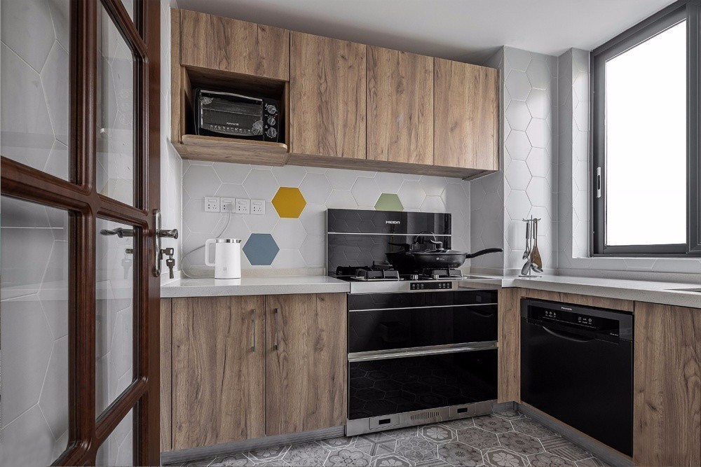 廚房墻面鋪設(shè)淺灰色六角磚,點(diǎn)綴藍(lán)色黃色與綠色,為空間增添了跳躍靈動感。與木質(zhì)櫥柜完美結(jié)合,簡約自然中透露著精致感。