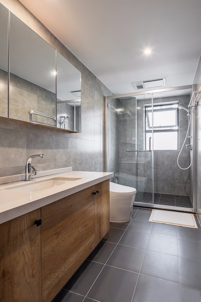 打通次衛(wèi)干濕分區(qū)的一堵墻,采用玻璃隔斷的設(shè)計,既不怎么占用空間,視覺上也變得很寬敞。超大的浴室柜真的很實(shí)用,大面積的鏡柜方便收納各種瓶瓶罐罐。: