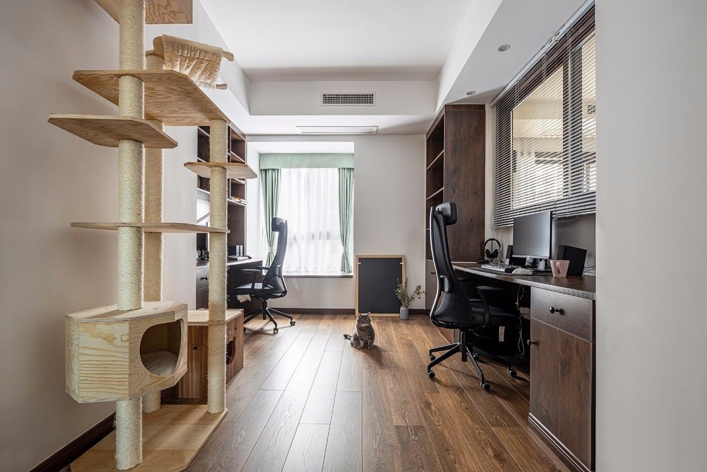 書房,貓爬架滿足了貓咪的娛樂,兩個書桌的設(shè)計,為愛打游戲更愛工作的屋主提供一個自由而愜意的空間。書房與客廳打通之后,采光通風(fēng)都增強(qiáng)了不少。百葉窗簾具有良好的透氣性和隱私性,還可以提升空間的顏值與氣質(zhì)。