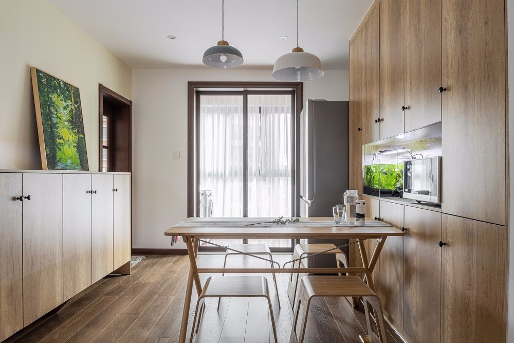 原木餐桌搭配簡單實(shí)用的紙片凳,簡約樸質(zhì)而又利落。餐邊柜中空的設(shè)計,方便以后添置使用各種家電,提升幸福感與實(shí)用度。廚房墻面鋪設(shè)淺灰色六角磚,點(diǎn)綴藍(lán)色黃色與綠色,為空間增添了跳躍靈動感。與木質(zhì)櫥柜完美結(jié)合,簡約自然中透露著精致感。