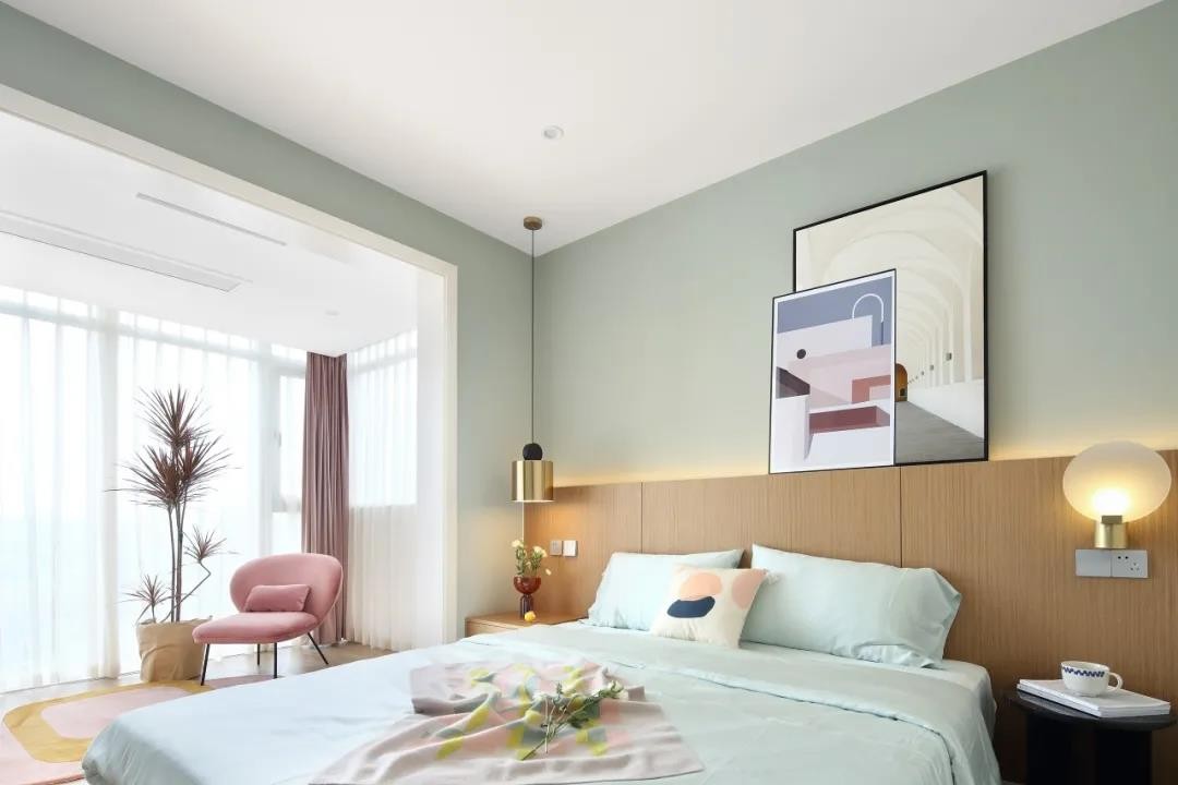 臥室空間整體淡藍(lán)色的墻面,床頭墻的墻腳是木飾面的材質(zhì),加入壁燈吊燈與燈帶,布置裝飾畫(huà),簡(jiǎn)約自然的床單,讓空間顯得清新優(yōu)雅而文藝。