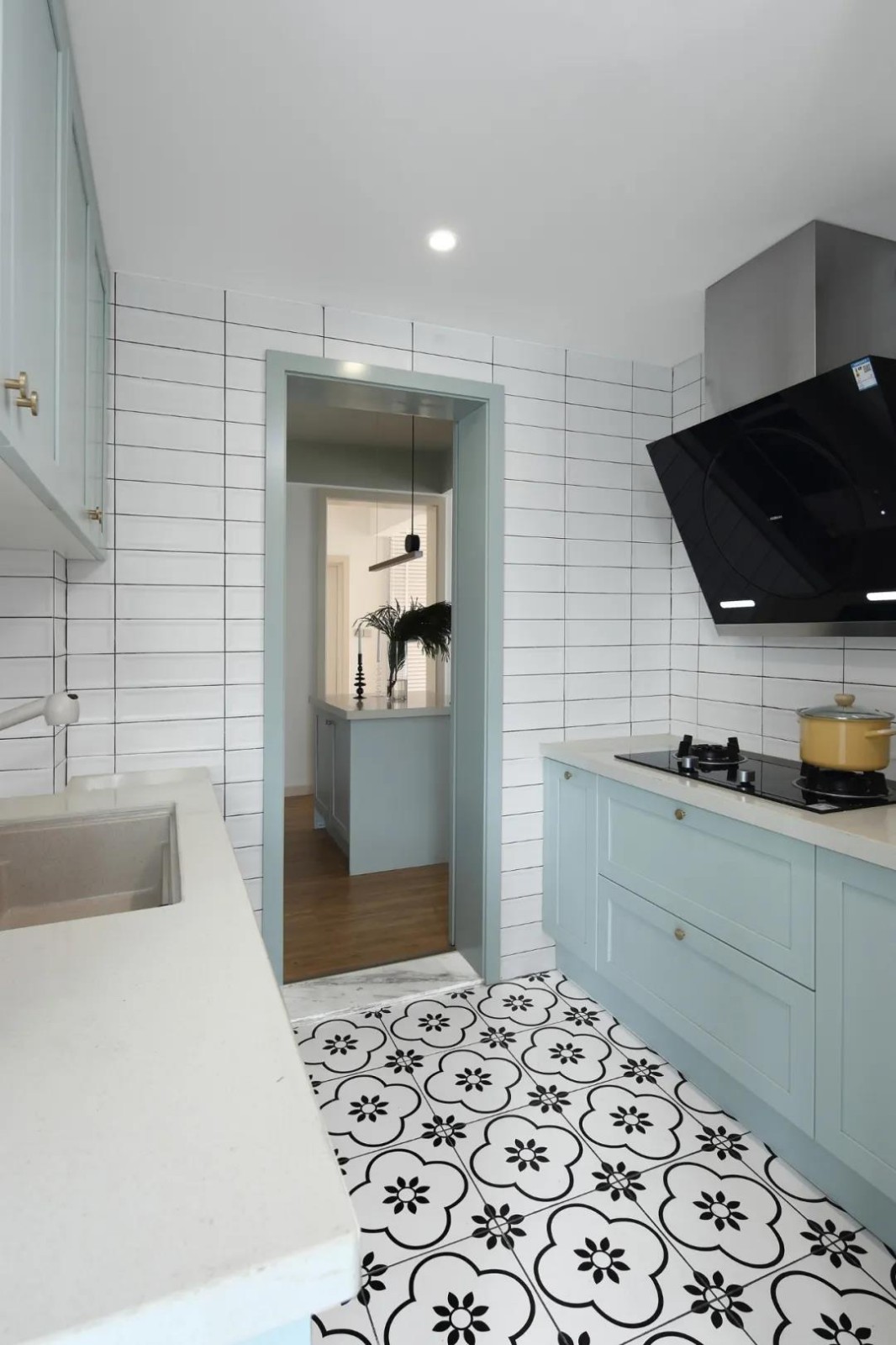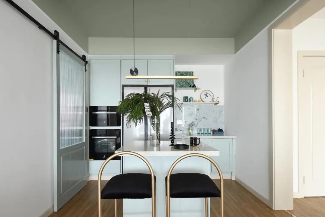 廚房在梅花磚地面+小白磚墻面的空間硬裝,定制淡藍(lán)色櫥柜,白色的臺(tái)面,讓做飯的氛圍顯得小資而又文藝舒適。