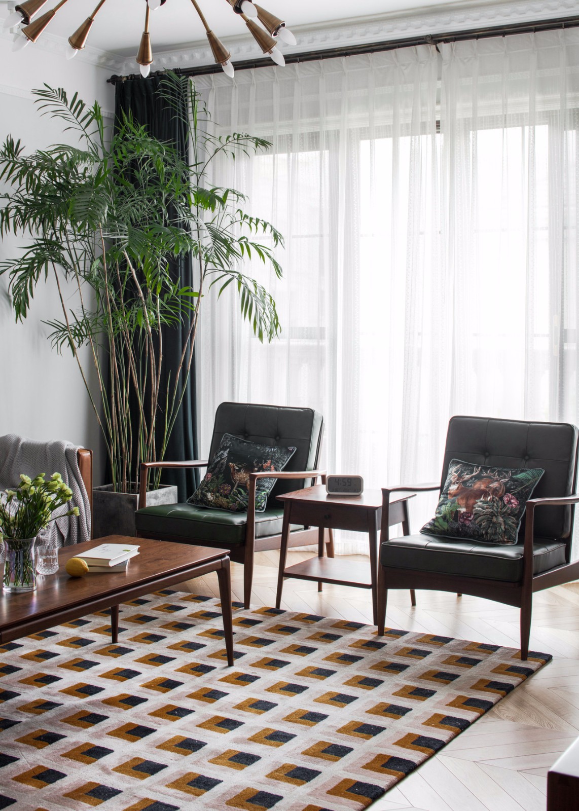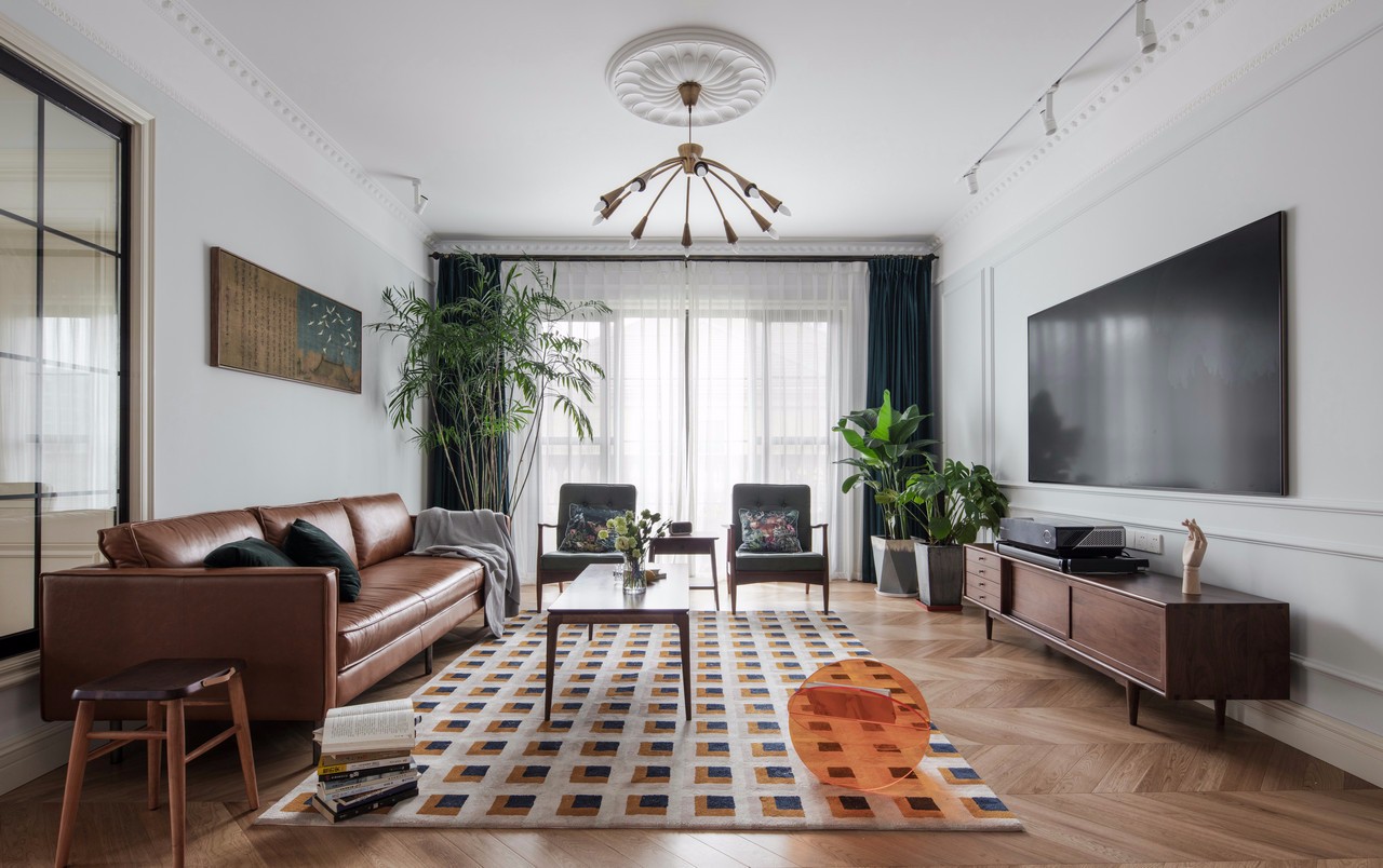 客廳大體是一家三口最長活動場所,這個區(qū)域我總體采用的功能性和美觀性結(jié)合的方式。 整體色調(diào)的統(tǒng)一:整體以胡桃實(shí)木的顏色做總色調(diào),從胡桃實(shí)木的茶幾到胡桃木的電視柜,再到棕色調(diào)的真皮沙發(fā),最后再是一塊長方形的大地毯,做幾個顏色(淺白+棕色+黑色)的重疊,與整個空間所有顏色進(jìn)行呼應(yīng)。房主很喜歡夏威椰,因?yàn)橛兄竦臍赓|(zhì),因此它別名也叫夏威夷竹子。濃綠的色彩,茂密的枝條,富有光澤的綠葉傳遞給人一種欣欣向榮的精神氣。它能通過呼吸微調(diào)節(jié)空氣環(huán)境,吸收房中甲醛等揮發(fā)性物質(zhì)。從風(fēng)水上來講,它放在柱子下面有去煞氣之說。