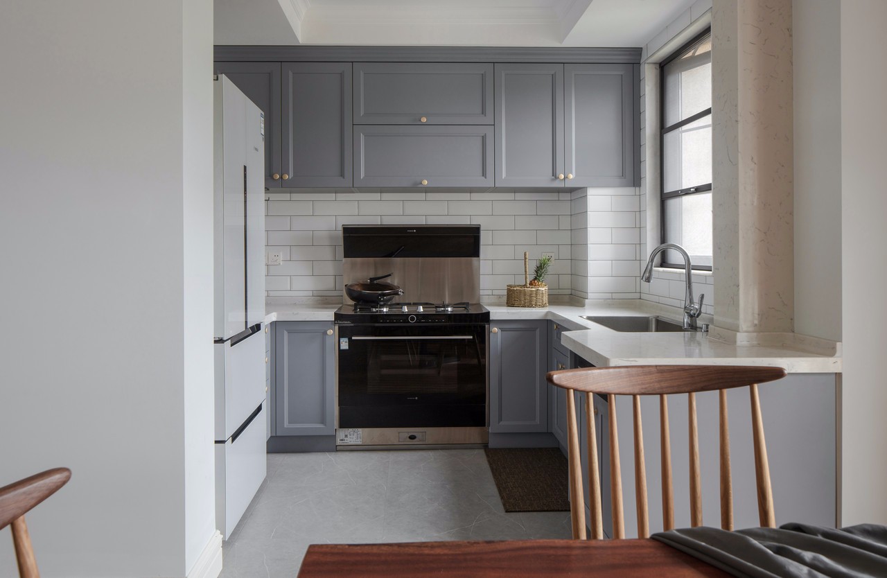 因廚房原來的面積本來就較小,為了改善這個問題,我們還是采用了開放式廚房。整個區(qū)域與餐廳區(qū)域結(jié)合,這里不做區(qū)隔,方便媽媽做菜的時候,可以和餐廳的人進(jìn)行互動。 當(dāng)然,開放式廚房,有一個小建議,因?yàn)槌床擞蜔煹膯栴},建議購買大功率吸油煙機(jī)。房東買的集成灶,既節(jié)省空間,也方便使用。因?yàn)槭占{空間足夠,所以平常不使用的時候,臺面也可以保持整潔如新。