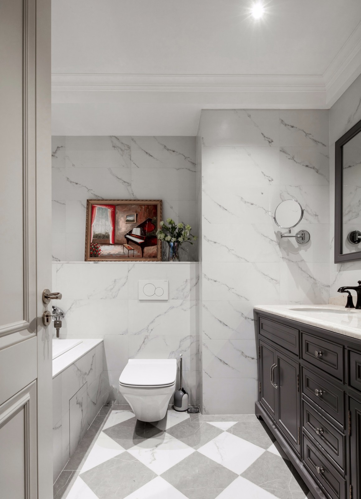 主臥的衛(wèi)生間滿足了房東的要求,浴缸+梳洗臺+儲物柜+馬桶全部都有。因?yàn)樵谥髋P,可以滿足泡澡需求而不被打擾,大概牙醫(yī)日常用來放松的場所。 墻面和浴缸表面均采用同樣花紋大理石,不規(guī)則的灰色紋路隨意點(diǎn)綴,任意而妄為;地上的大理石采用菱形灰白大理石,與墻體做呼應(yīng)。墻上的裝飾畫,我個人很喜歡,使整個使用空間格調(diào)迅速提高。