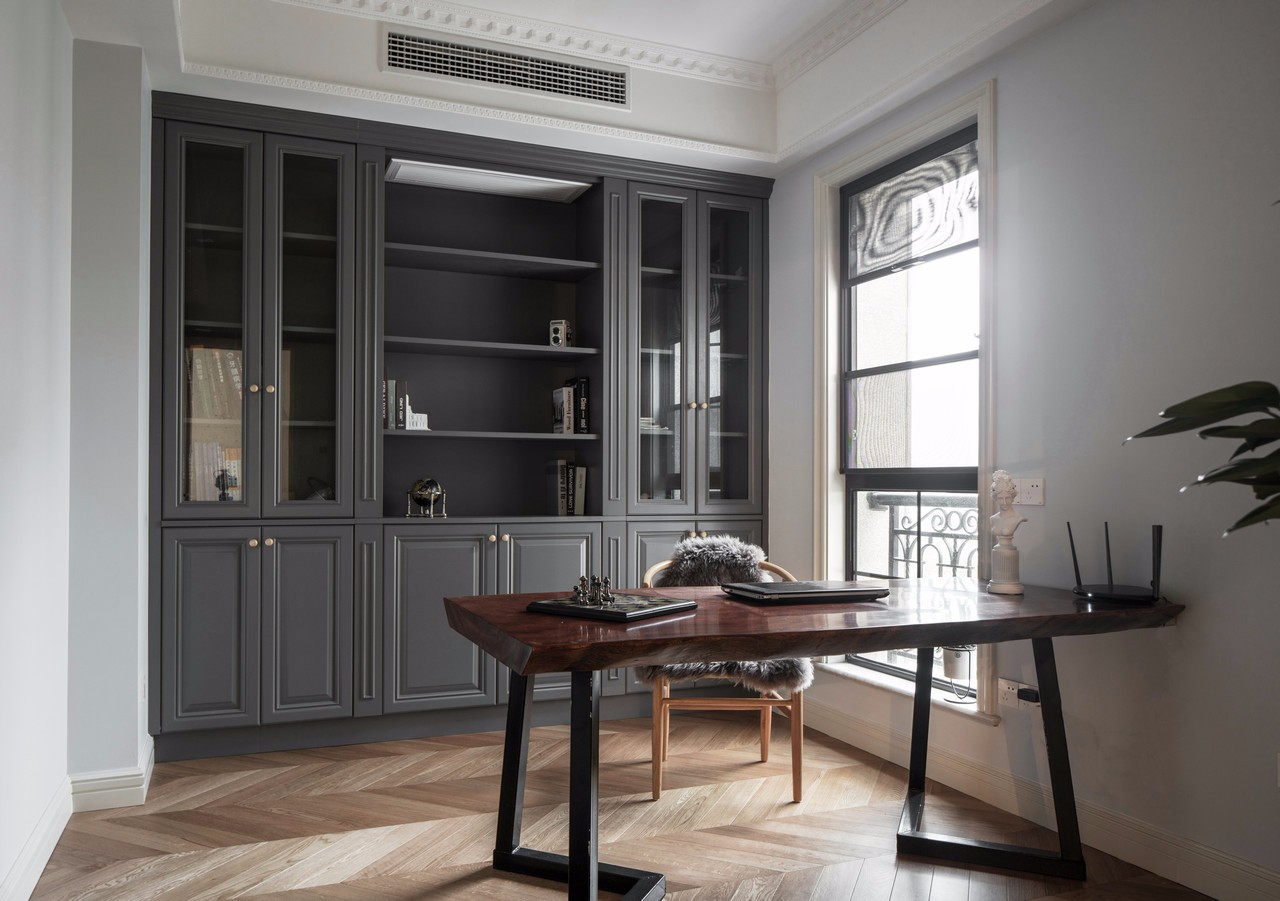 書房空間開放之后,光線充足,空間自由,全實(shí)木材質(zhì)的定制書桌書架,搭配原木色的椅子,十分有質(zhì)感。 這大概是房東的私人空間,墻面的部分做了櫥柜,方便擱置書籍和小禮物的地方。顏色調(diào)性和廚房櫥柜保持了一致。 書桌買了簡易型又文藝的桌子,甚至它可以搖身一變,變成茶室(自行想象)??拷皯舻奈恢茫彩菫榱瞬晒廨^好,方便閱讀和思考。有時候頭腦需要休息的時候,還可以向著窗外吹吹風(fēng),發(fā)發(fā)呆。