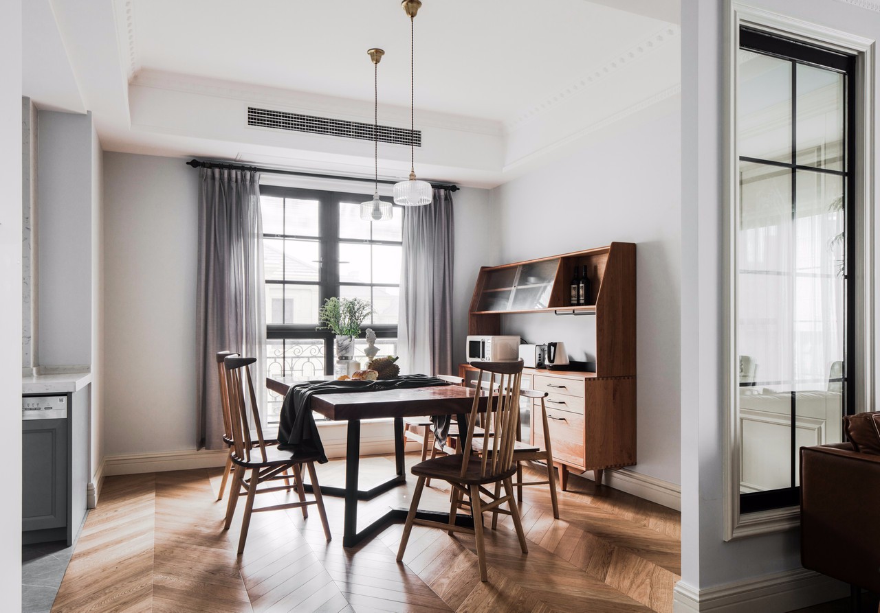 因日常只有三人食用,菜品不會很多,偶爾會有父母做客,滿足房主想要的長行餐桌(正好滿足五人食用,空間不會擁擠) 餐桌后面我又放置了一個儲物柜,色調(diào)與餐桌一致,兼顧了美感和平衡感??梢苑胖煤芏鄰N房放不下的東西(滿足房主喜歡東西擺放整齊的要求)