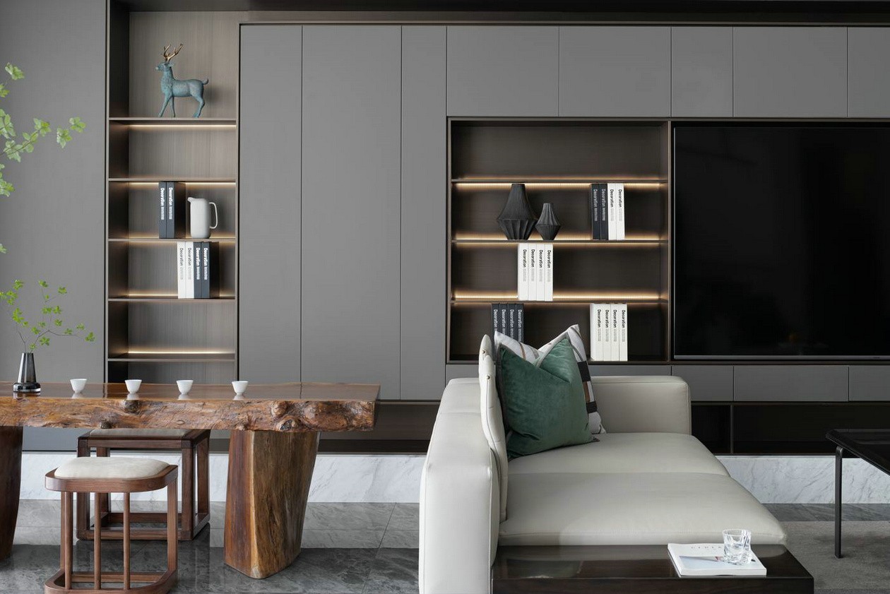 灰色的背景墻給人一種高級(jí)感,很大氣,不容易過(guò)時(shí)。