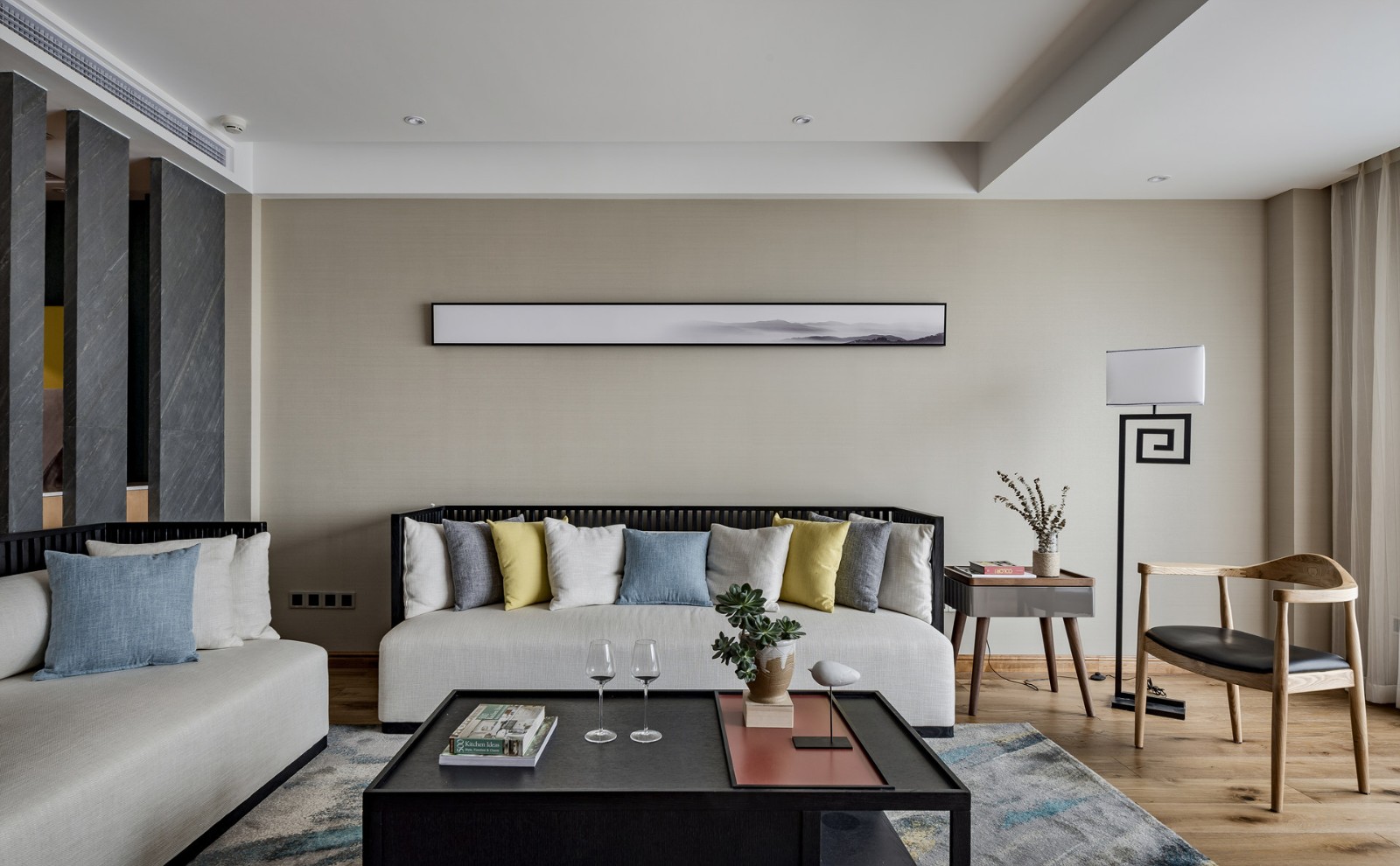 沙發(fā)背景墻珍珠白乳膠漆,新中式特有的落地?zé)?,?jiǎn)單的一副山水掛畫(huà)就能體現(xiàn)業(yè)主的品味。